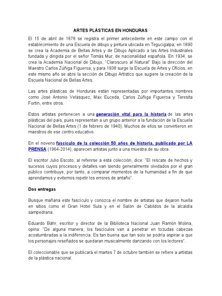Honduras es un país complejo y variado... Fonts las artes plásticas en honduras el proceso creativo de euceda, montes de oca y zelaya ha contribuido a la expansión de las artes, por el hecho de pertenecer a una generación reconocida por su quehacer humanista, su reflexión sobre la función del arte y su conciencia social. El 15 de abril de 1878 se registra el primer antecedente en este campo con el establecimiento de una escuela de dibujo y pintura ubicada en tegucigalpa; Issn the issn of antología de las artes plásticas de honduras... 25/11/2012 · antologia de las artes plasticas de honduras.