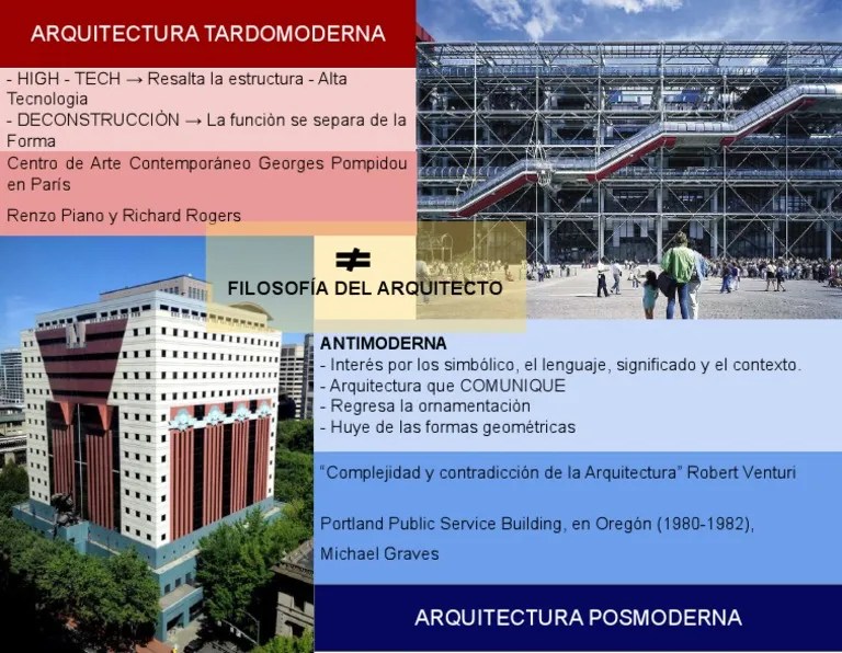 Principales exponentes de la arquitectura tardomoderna. Renunciar al racionalismo funcionalista, es la continuación del movimiento racionalista y. Arquitectura tardomoderna y posmoderna esquema: La arquitectura en los años 50.. En todos sus proyectos se puede evidenciar una claridad formal que tiene que que refleja la importancia de.